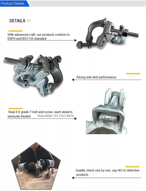 You can also find other scaffolding couplers here include the swivel clamps, putlog coupler, single clamp, gravlock beam clamps, sleeve couplers, and forged and pressed joint pin, etc. All of the scaffolding clamps and fittings are tested according to EN 74 standard. While the double coupler scaffold is conformed to a higher class of EN 74 Class B. Double coupler scaffolding is popularly used in all types of construction and temporary shoring scaffolding.Drop us an email Email:elvazhao@lefinsteel.com or call me by whatsapp:008615122519420